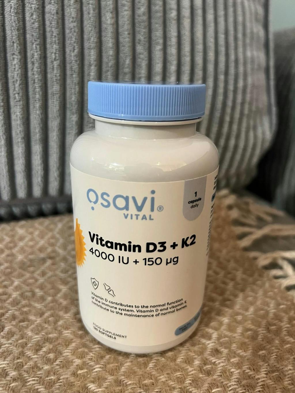 Vitamina D3 cu K2 Osavi 120 capsule moi este o formulă sinergică premium cu D3 natural Quali®-D (4000 IU) și K2 bioactiv K2VITAL® MK-7 (150 mcg), dizolvate în ulei MCT din nucă de cocos pentru o absorbție foarte bună. Combinația D3+K2 este considerată de mulți specialiști drept „standard de referință" atunci când vine vorba de susținerea sănătății oaselor, dinților și a sistemului imunitar.